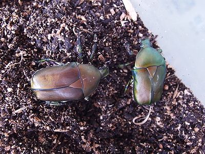 2023-08-25 そろそろカナブンの季節も終わりかな 飼育中のカナブンさんが、数日のうちに次々と世を去っています。まだ、2匹が生存していますが、あまり元気がありません。 野外で確認してみると、カナブンさんがいつも集まっていたクヌギの樹には、もう一匹もみられなくなっていました。かわりにヒラタクワガタが樹液を吸っています。 そろそろカナブンの季節も終わりですね。